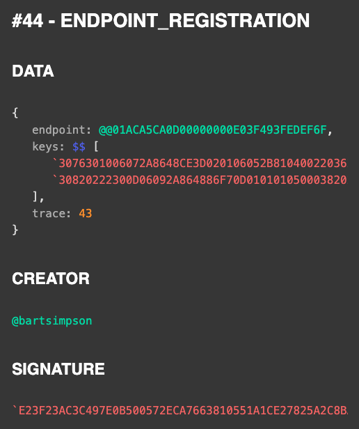 The example from above shows that the endpoint @bartsimpson was created and signed by the trusted @+unyt_auth entity. This new link in the trust chain means that all participants in the network who trust unyt Auth can now also trust the @bartsimpson endpoint. Yeah maybe Bart Simpson is a bad example when talking about trust - make sure to never trust Bart - but the principle should be clearer for now.