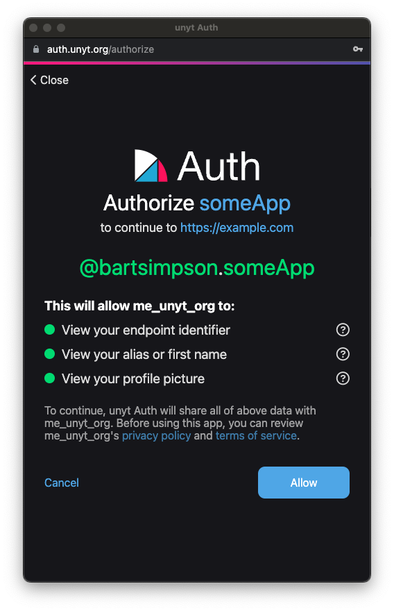 The basic security measure of unyt Auth is never to pass on the access data (private keys) of the main endpoint to third parties. For this reason, neither the private keys to the app nor central session ids are issued. For this reason, an app-specific endpoint is created for each app (@bartsimpson.reddit, @bartsimpson.github), which are completely isolated from each other and do not share any key files.