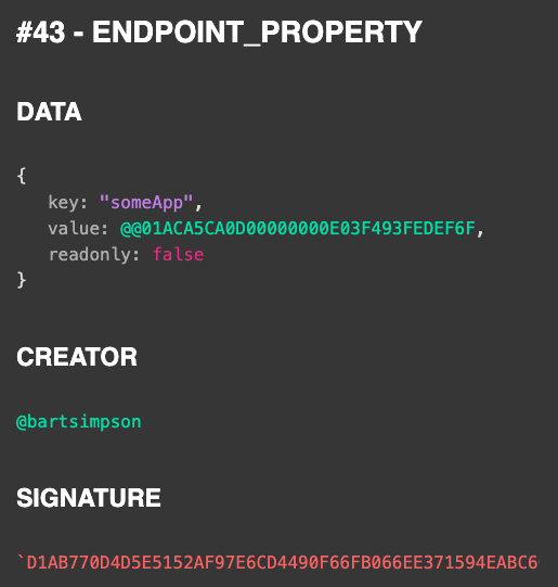 In the example from above you can tell that @bartsimpson has registered for an app “someApp” by creating and assigning an app-specific anonymous endpoint with the id @@01ACA5CA0D00000000E03F493FEDEF6F.