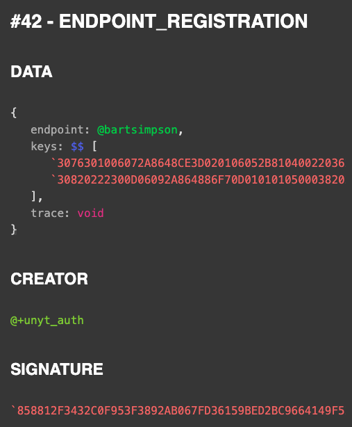 The above graphic shows the registration entry similar to the registration for the main endpoint with the difference that the creator no longer is the @+unyt_auth entity but the personal main endpoint @bartsimpson of the requester.